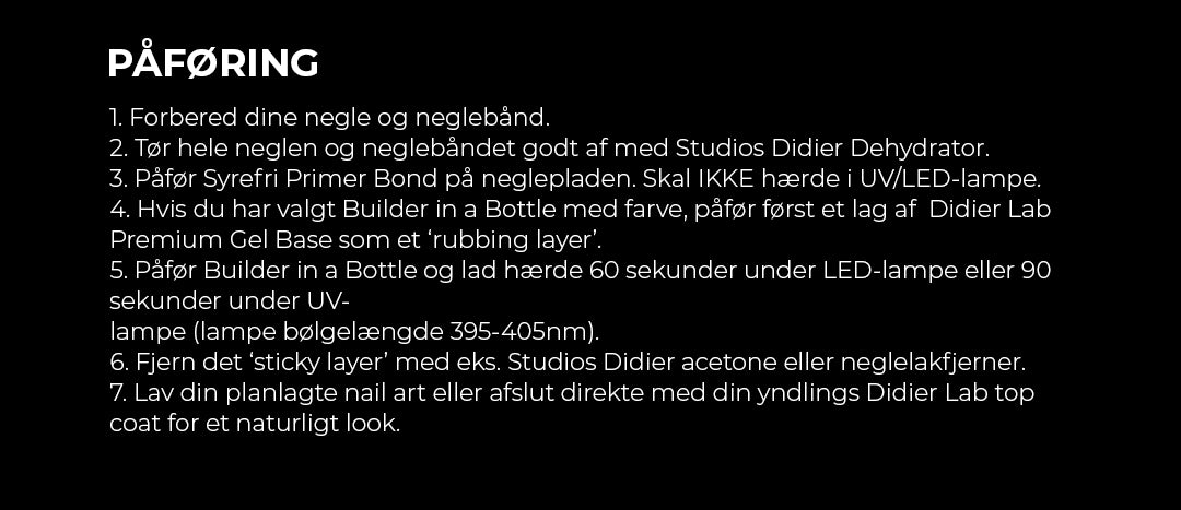 5. Påfør Builder Gel BBIO og lad hærde 60 sekunder under LED-lampe eller 90 sekunder under UV-lampe (lampe bølgelængde 395-405nm).
