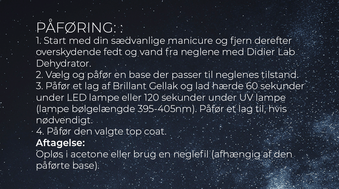 5. Påfør et tyndt, jævnt lag af Brillant Gellak og lad hærde 60 sekunder under LED-lampe eller 120 sekunder under UV-lampe (lampe bølgelængde 395-405nm).
