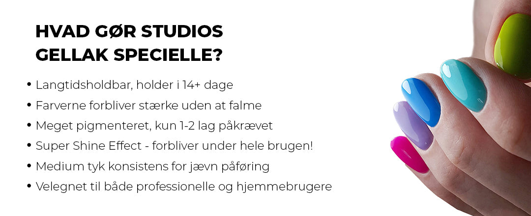 Studios Didier Gellak giver let en smuk og jævn dækning. Lakken har en særlig konsistens, der gør den nem at påføre, samtidig med at den sikrer et flot og langtidsholdbart resultat. Takket være lakkens Super Shine Effect bevares farven på neglene både i intensitet og nuance.