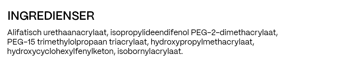 nol PEG-2 Dimethacrylate, PEG-15 Trimethylolpropane Triacrylate, Hydroxypropyl Methacrylate, Hydroxycyclohexyl Phenyl Ketone, Isobornyl Acrylate.